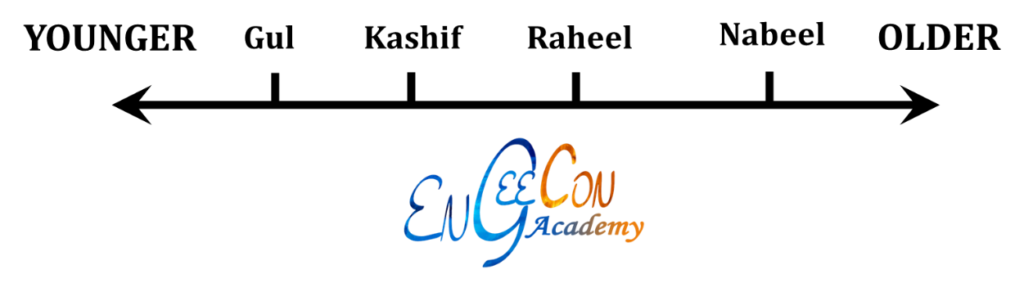 If Raheel is two months older than Gul, then Nabeel is three months older than Gul and one month older than Raheel. Kashif is younger than both Raheel and Nabeel. Nabeel is the oldest.
